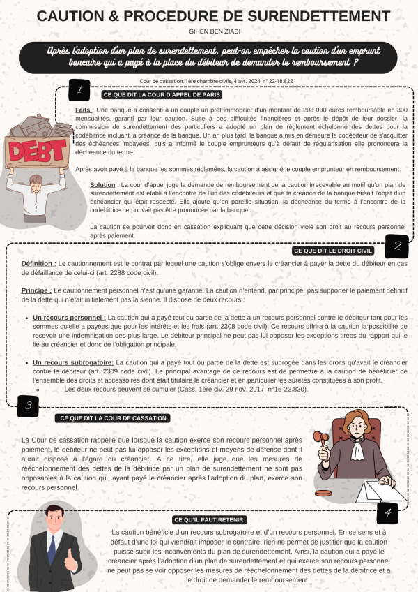 La Cour de cassation dans un arrêt du 04 avril 2024 a précisé que « Les mesures de rééchelonnement des dettes du débiteur par un plan de surendettement ne sont pas opposables à la caution qui, ayant payé le créancier après l'adoption du plan, exerce son recours personnel » (Cour de cassation, 1ère chambre civile, 4 avr. 2024, n° 22-18.822).