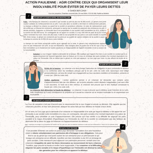 Face à cette manœuvre, la banque a décidé d’engager une action paulienne pour contester ces transactions.