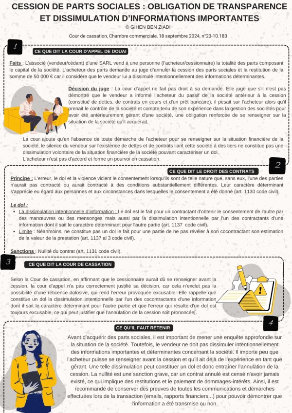 JURISCAP - CESSION DE PARTS SOCIALES : OBLIGATION DE TRANSPARENCE ET DISSIMULATION D’INFORMATIONS IMPORTANTES par Gihen BEN ZIADI