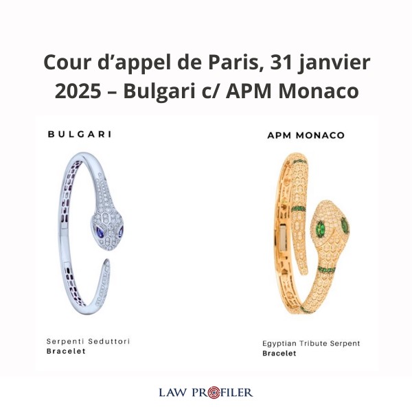 ⚖️ La maison Bulgari reprochait à APM Monaco d’avoir commercialisé des bijoux en forme de serpent proches de sa collection iconique Serpenti. L’action reposait à la fois sur la contrefaçon de droits d’auteur et, à titre subsidiaire, sur le parasitisme.