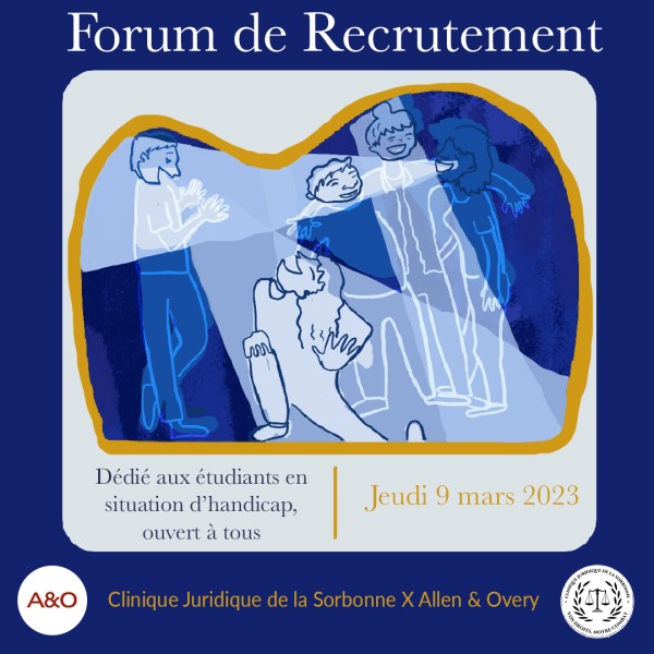 L’association de la Clinique Juridique de La Sorbonne et ses partenaires organisent un forum de recrutement conçu pour les étudiants en situation de handicap le jeudi 9 mars 2023 à 14h30 au sein du cabinet Allen & Overy !