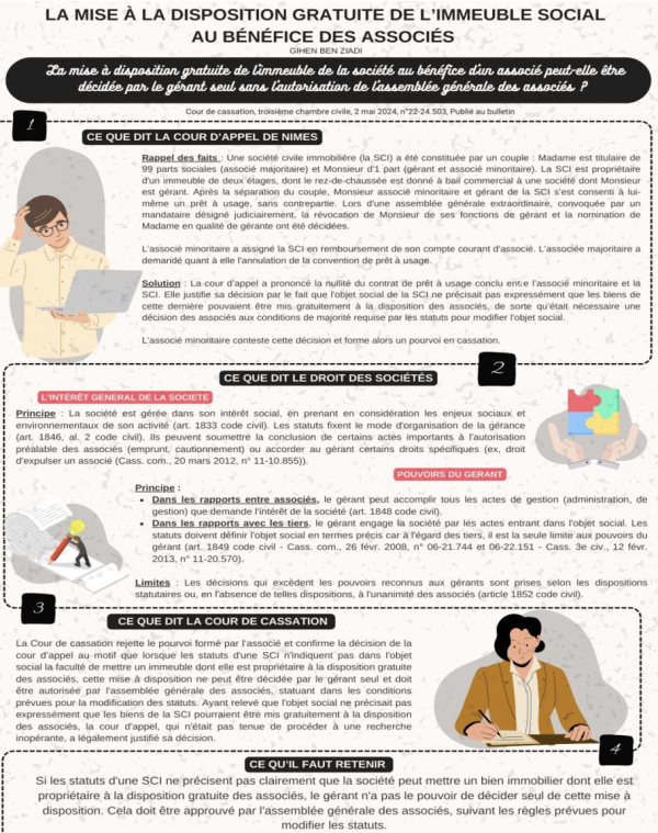 Ce qu'il est important de comprendre ici c'est que la mise à disposition gratuite d'un bien immobilier dont la société serait propriétaire n'est pas interdite mais qu'elle doit satisfaire aux règles prévues par les statuts et donc être votée et autorisée par l'assemblée générale des associés. Le gérant n'a pas le pouvoir de décider seul.